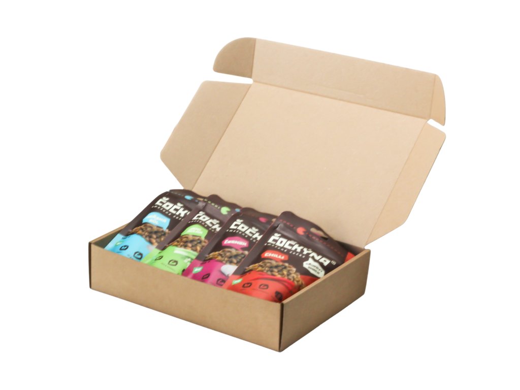Vyzkoušej všechny naše varienty najednou! Čočkýna Ochutnávkový box ti nabídne mix našich slaných i sladkých křupavých chutí – poctivou mořskou sůl, pikantní chilli, voňavý česnek, osvěžující jarní cibulku a z řad sladkého jemný zázvor, voňavou skořici, lahodné kakao a neodolatelný slaný karamel. Každý balíček je plný bílkovin, vlákniny a hlavně výtečné chuti!